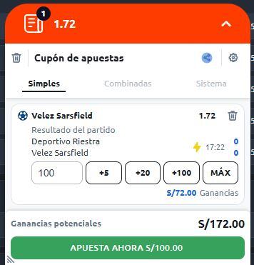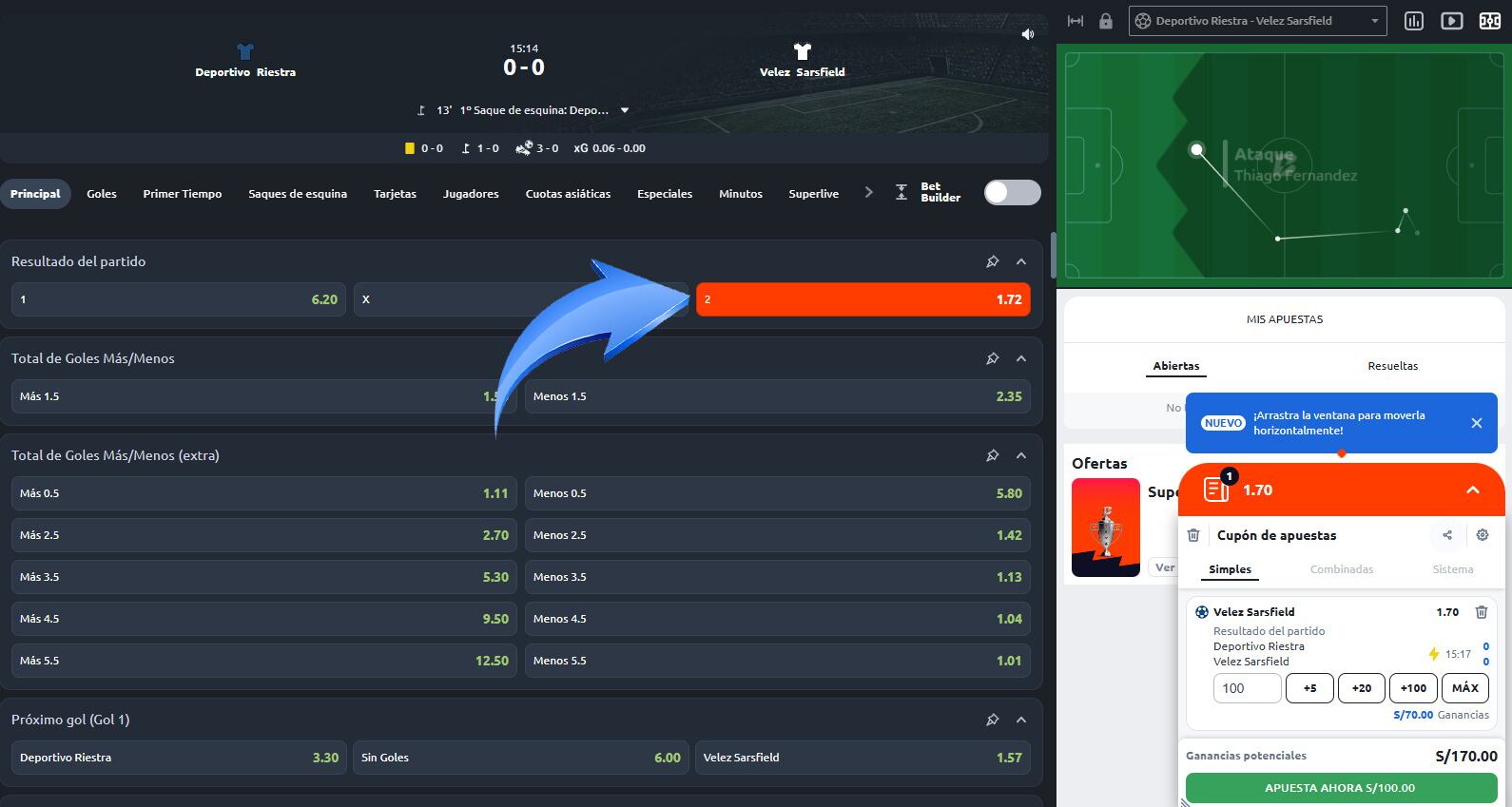 Haz clic en la cuota que deseas y se añadirá automáticamente a tu boleto de apuestas. Aquí podrás ajustar el monto que quieres apostar y confirmar tu selección.