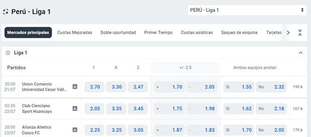 - En la sección ‘apuestas deportivas’ elige ‘fútbol’ – ‘Liga 1 Perú’.