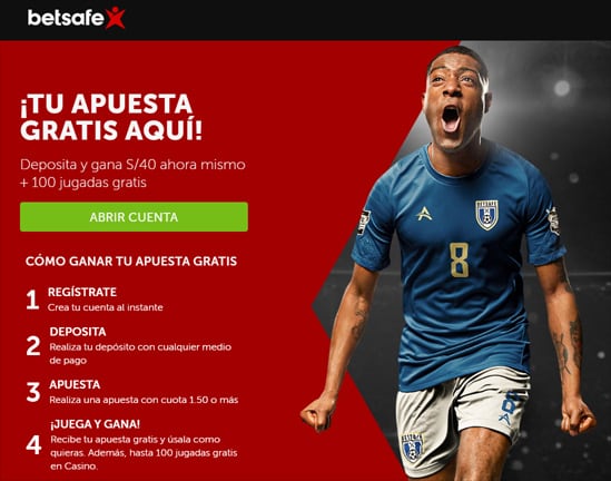 En lo que respecta al bono de bienvenida de apuestas deportivas, Betsafe brinda una apuesta gratuita de S/40 por el primer depósito más 100 jugadas gratis por montos de recarga de mínimo S/40. Esta promoción tiene rollover x3 en apuesta combinada con cuota de 1.50 o más.