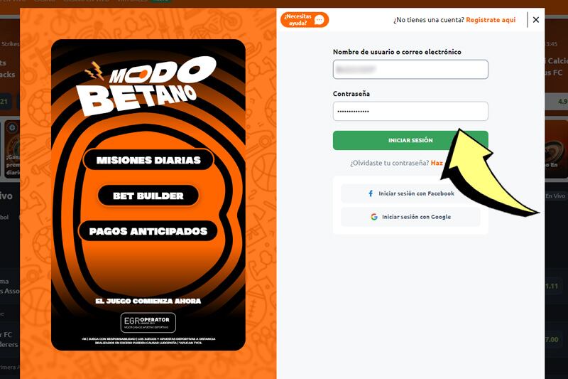 - Accede a tu cuenta Betano haciendo clic en Ingresar. Coloca tu nombre de usuario y contraseña.