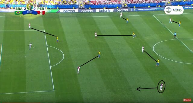 Acumular gente por dentro para encontrar espacios por fuera es una de las consignas del equipo de Tite, y Perú sí que lo sufrió en fase de grupos, y más con lanzadores como Arthur, Coutinho y Casemiro. Hay dos opciones en este caso: se lleva a cabo una presión post-pérdida más rápida (2 o 3 hombres sobre el receptor) o se para un equipo menos compacto, llevando a los laterales a estar más cerca a los extremos.