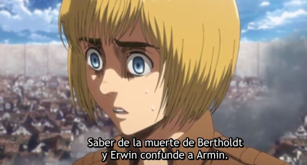 El próximo episodio también abordará el cambio de Armin, quien ahora tiene los poderes del Titán Colosal tras comerse, siendo titán, a Bertholdt. Armin, además, deberá conciliar la idea de asumir el liderazgo táctico de la humanidad después de que el comandante Erwin le cediera la inyección que permitió que siga con vida y que se convirtiera en la segunda esperanza de la raza humana.