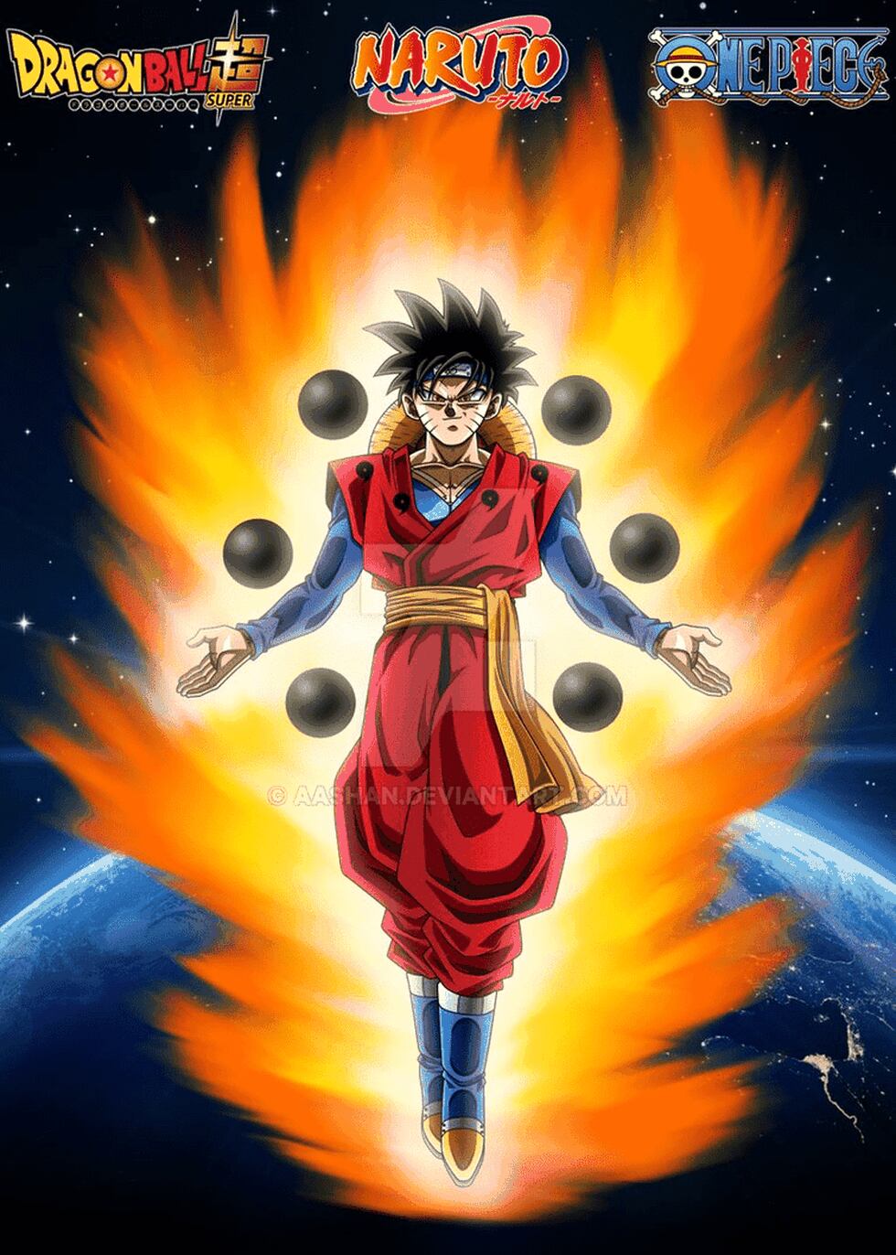 El artista independiente AashanAnimeArt, quien dice ser un fanático de Dragon Ball Super, Naruto y One Pice, hizo un diseño de los tres personajes principales de dichos animes dentro de un solo ser.