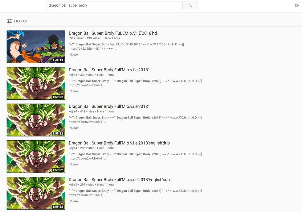 Solo tendrás que teclear Dragon Ball Super: Broly en YouTube y configurar la búsqueda según la fecha de carga para dar con los cientos de videos que fueron grabados desde la sala del cine. Obviamente, el material no está disponible en la mejor calidad, pues el ambiente oscuro hace que se pierda el foco momentáneamente y se escuchan las voces del resto de espectadores.