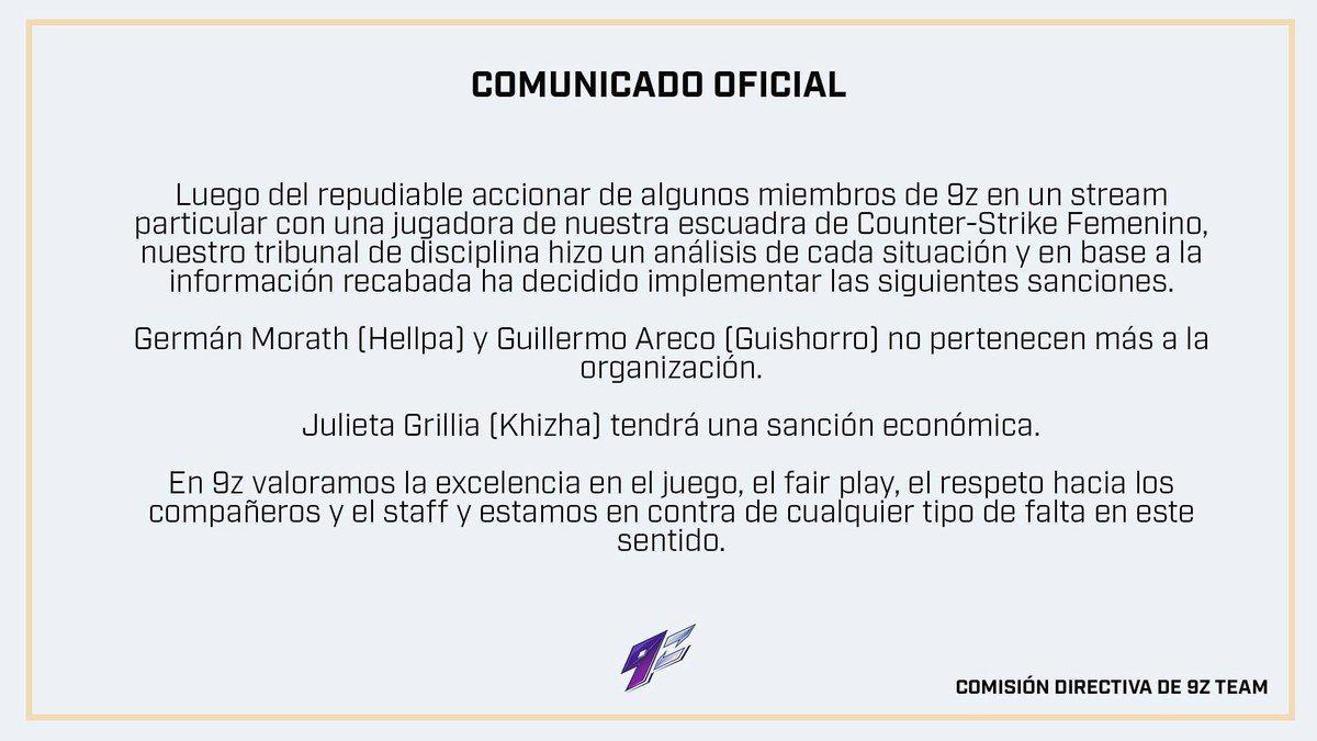 9z tomó inmediatamente cartas en el asunto. Guillermo “Guishorro” Areco y Germán “Hellpa” Morath serán separados de la organización, pese a las consecuencias que esto pueda traer para el desempeño del equipo.