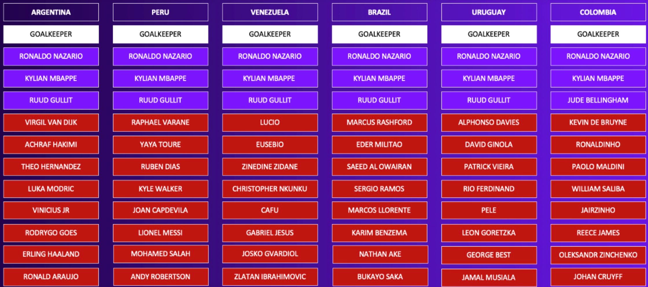 En el draft de playoffs, los jugadores clave de Perú son Ronaldo Nazario, Kylian Mbappe y Ruud Gullit. Además, cuentan con Raphael Varane, Yaya Toure, Ruben Dias, Kyle Walker, Joan Capdevila y Lionel Messi como jugadores seleccionados en el draft.