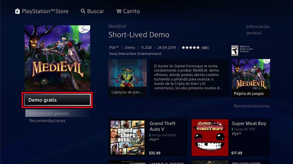Ingresa a tu cuenta de PlayStation Network y a la tienda virtual de la consola. Asegúrate de que tu PS4 está actualizada. Seguidamente ingresa a la pestaña de Demos, allí encontrarás algunos títulos como NBA 2K20. Simplemente busca MediEvil y presiona el botón "Demo gratis".