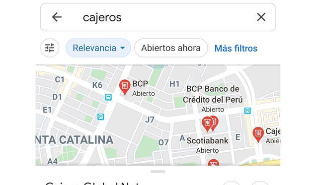 Para poder encontrar un cajero cerca y no quedarte sin efectivo, deberás colocar en la barra de búsqueda: Cajeros. El mapa de Google lanzará una serie de lugares desde donde puedes retirar dinero.