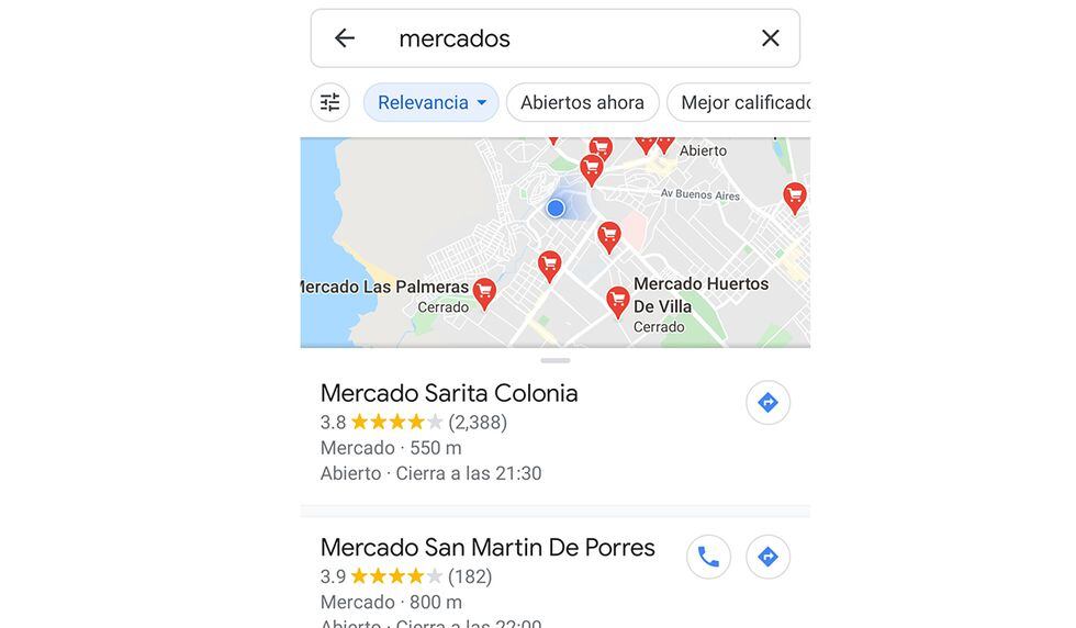El mapa te dice cuántas farmacias hay alrededor tuyo con solo digitar en el buscador la palabra “boticas”. Uno de los más buscados son los mercados. Si bien te brinda información sobre dónde quedan, Google Maps también te dice los horarios.