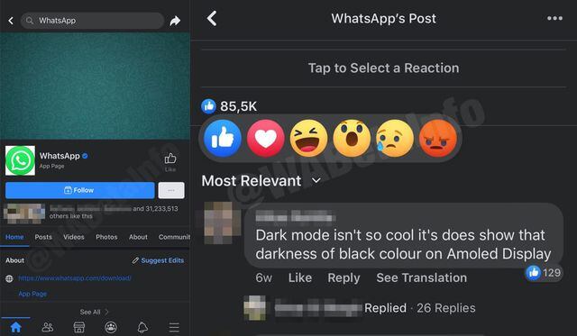 WABeta Info manifiesta que todavía se está trabajando por lo que algunos elementos aún tienen colores incorrectos, por ejemplo, la barra de estado negra en varias secciones o el fondo blanco debajo de la imagen de perfil. Pero, como puede ver, Facebook ha alcanzado buenos resultados y casi todo en la aplicación admite el “Modo oscuro”.