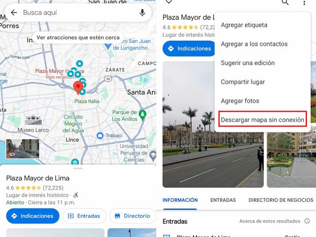 - En ese instante pulsa sobre los tres puntitos de la esquina superior y presiona en donde dice “Descargar mapa sin conexión”.