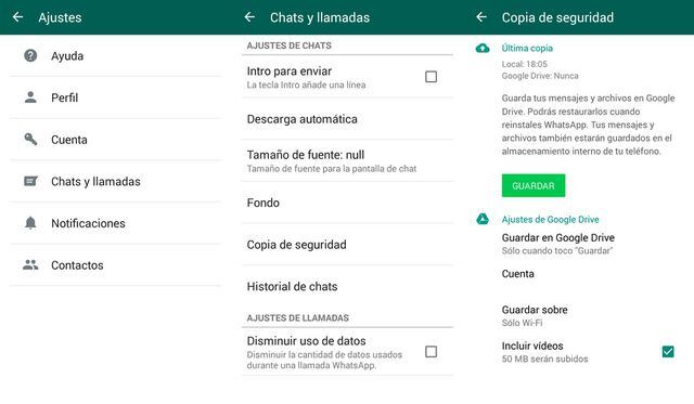 El primer paso que debes realizar es asegurarte de que la copia de seguridad que se guarda todos los días incluya todos los videos y fotos que compartes. Para ello simplemente deberás ir a Ajustes, luego a Chats y allí pulsar sobre Copia de Seguridad.