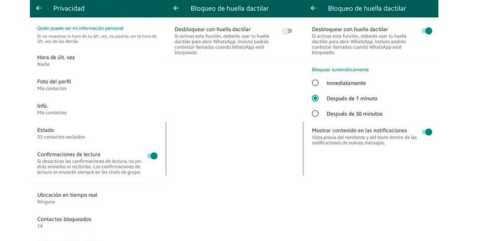 También te permite elegir el tiempo que tarda la app en bloquearse y requerir de la huella: Inmediatamente, después de 1 minuto, y después de 30 minutos (en iOS también puede elegirse 15 minutos).