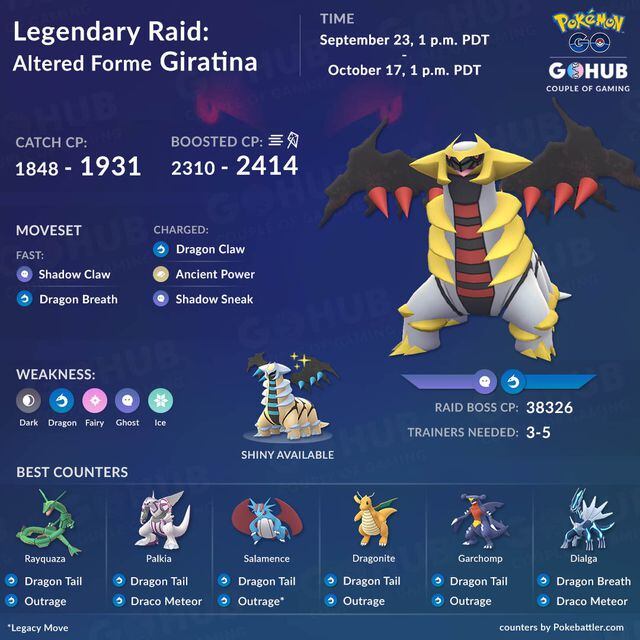 A su vez, para el 25 de septiembre se ha preparado una mejora para Giratina desde las 6:00 p.m. hasta las 7:00 p.m. (hora de Perú). Esta es tu oportunidad para capturar a esta criatura legendaria y registrarla en tu Pokédex.