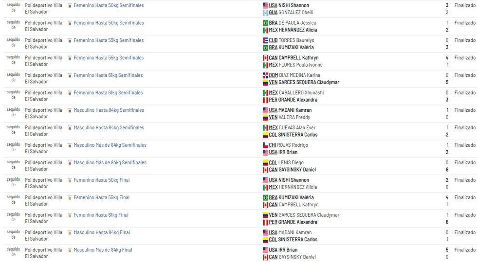 Este sábado, serán cinco los peruanos que participarán en los Juegos Panamericanos: Selene Rodríguez (femenino hasta 50 kg), Alessandra Vindrola (femenino hasta 55 kg), Carlos Mendoza (masculino hasta 84 kg), Jorge Beltrán (masculino más de 84kg) y Alexandra Grande (femenino hasta 61 kg).