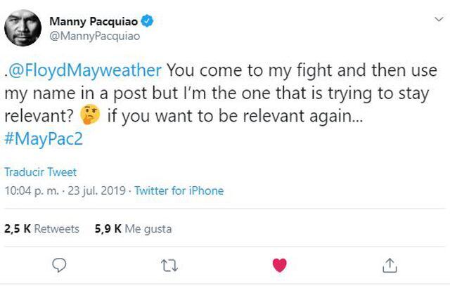 Sin embargo, Manny Pacquiao -en su última tweet- dejó de lado el retiro de Floyd Mayweather y lo retó. "Vienes a mi pelea y luego usas mi nombre en una publicación, pero yo soy el que está tratando de seguir siendo relevante, Si quieres volver a ser relevante #MayPac2", escribió.