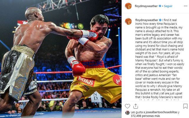 Un comentario del filipino que obedece a la publicación más reciente de Mayweather en Instagram. "Me parece muy irónico cómo cada vez que el nombre de Pacquiao aparece en los medios, mi nombre siempre está vinculado a él. Todo el legado y la carrera de este hombre se ha construido a partir de su asociación con mi nombre y es hora de que dejar que el nombre de ese hombre tenga su propio peso", señaló 'Money'.
