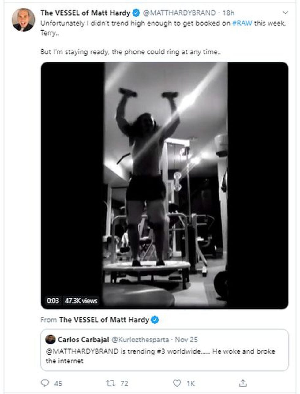 Se pensaba que la empresa volvería a contar con Matt en el show rojo de esta semana. Lamentablemente, no fue así. Durante la emisión del programa, en la noche del último lunes, un usuario de Twitter le comentó: “Matt Hardy es la tercera tendencia a nivel mundial. Despertó e hizo explotar el internet”.