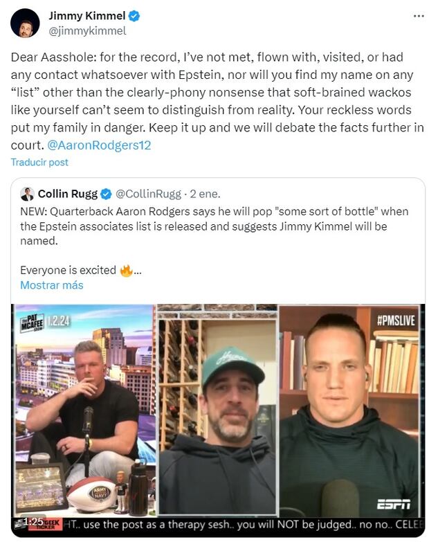 La divulgación de documentos relacionados con Jeffrey Epstein causó un gran impacto en las redes sociales, ya que insinuaban la posible implicación de diversas celebridades en casos de pedofilia. Durante una entrevista en el programa de Pat McAfee, el quarterback, Aaron Rodgers mencionó que el presentador estadounidense Jimmy Kimmel podría figurar en las lista. Después de estas afirmaciones, Kimmel expresó su descontento y declaró su intención de interponer una demanda contra la estrella de la NFL.