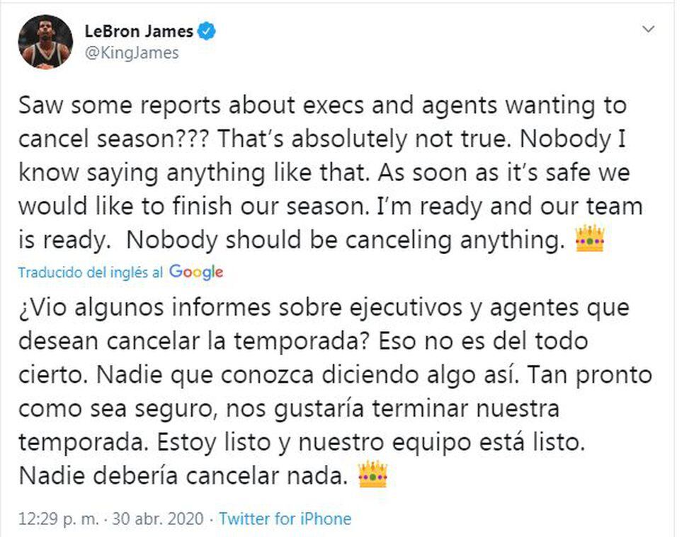 “No es verdad en absoluto. Nadie que yo conozca está diciendo algo parecido. Tan pronto como sea seguro nos gustaría terminar la temporada. Yo estoy preparado y nuestro equipo está preparado. Nadie debería cancelar nada”, escribió James.