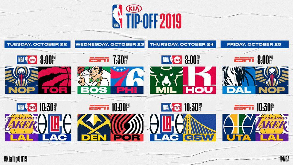 La temporada 2019-20 comienza el 22 de octubre con un doble cartelera que tendrá de protagonistas a los Pelicans de Nueva Orleans que visitan a los Raptors, en la noche de la entrega de los anillos de campeones de la NBA, y los Lakers jugaran en el Staples Center como visitantes ante los Clippers en el primer gran duelo entre los equipos angelinos.