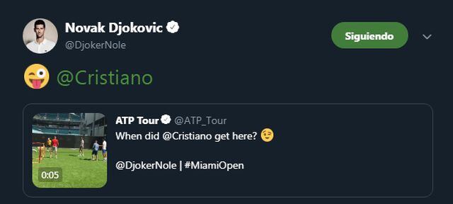 Djokovic respondió el tuit. El tenista colocó un emoji guiñando el ojo y sacando la lengua; además, el portugués fue etiquetado en dicho post por 'Nole', quien debutará este viernes en Miami contra el australiano Bernard Tomic.