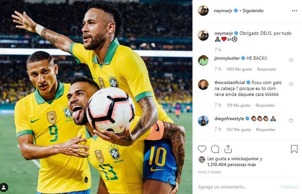 "Gracias Dios por todo", publicó Neymar junto a una en la que aparece con Dani Alves y Richarlison celebrando el gol del 2-2 ante Colombia. Como era de esperarse, la publicación del brasileño se convirtió en un viral de redes sociales.