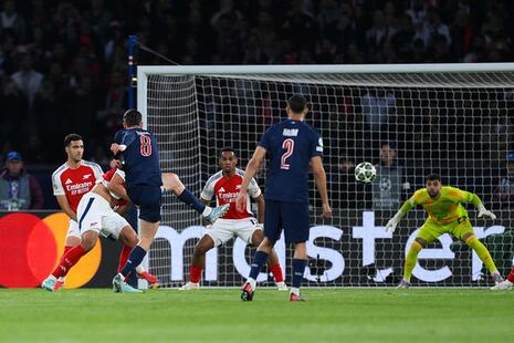 Mal remate de Joao Neves tras pase de Barcola. El PSG tuvo la chance del 2-0. Saque de meta para el Arsenal.