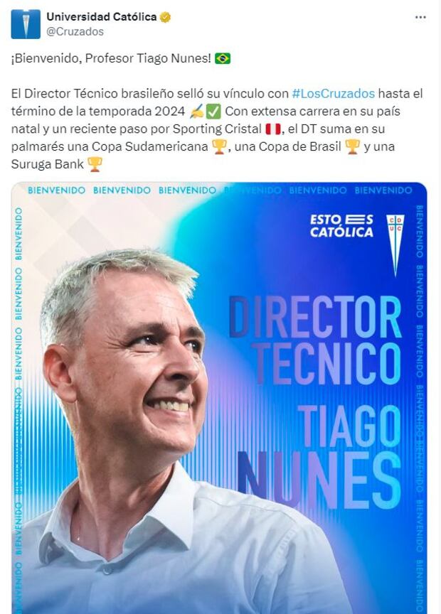 “Estamos muy contentos de comunicar la llegada a Universidad Católica de nuestro nuevo entrenador, Tiago Nunes. Desde que nos reunimos con él tuvimos la convicción de que podría ser un entrenador idóneo para este equipo, por el trabajo del que viene precedido y sus características personales y profesionales, además de las múltiples referencias que tuvimos de su trabajo”, dijo el presidente de los ‘Cruzados’.