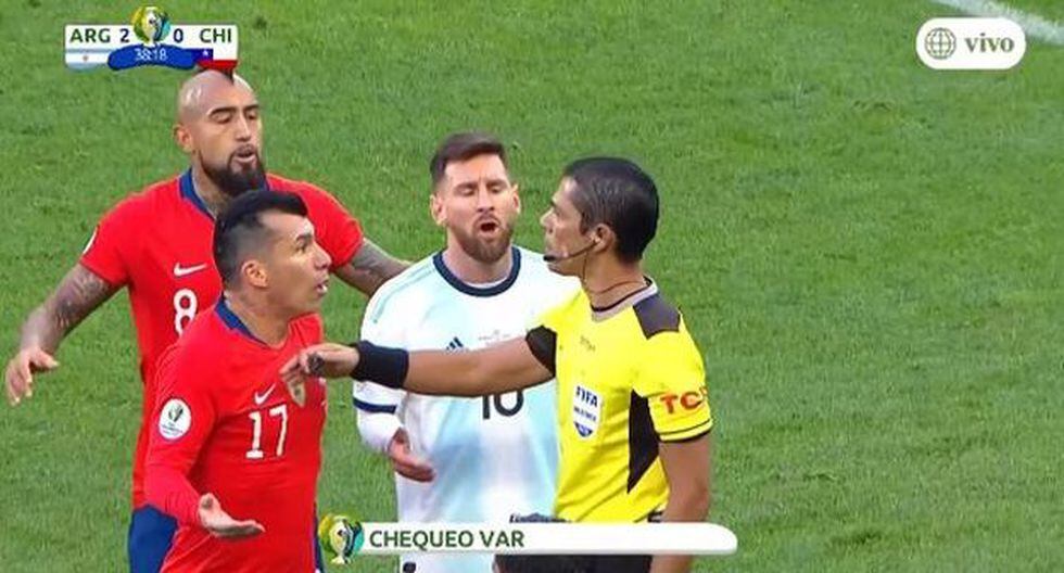 El chileno se quejó de un empujón de Messi y ambos jugadores se encararon, quedando cabeza con cabeza. Según las imágenes de televisión, Medel trató de dar un cabezazo en dos ocasiones al delantero de Argentina, que se retiró para no ser golpeado.