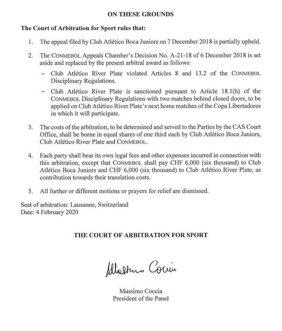 Finalmente, el TAS dictaminó que River Plate y Boca Juniors deben encargarse -por partes iguales- de solventar los gastos generados durante el procedimiento. Eso sí, las dos instituciones quedaron libres de sanciones económicas.