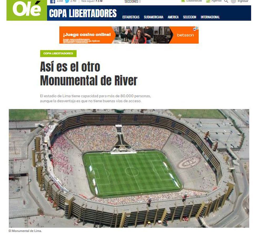 La final de la Copa Libertadores 2019 se jugará en el Estadio Monumental de Lima el 23 de noviembre. Una vez oficializada la nueva sede, diversos medios deportivos, como el diario Olé de Argentina, no tardaron en informar detalles del recinto que albergará el partido entre River Plate y Flamengo.