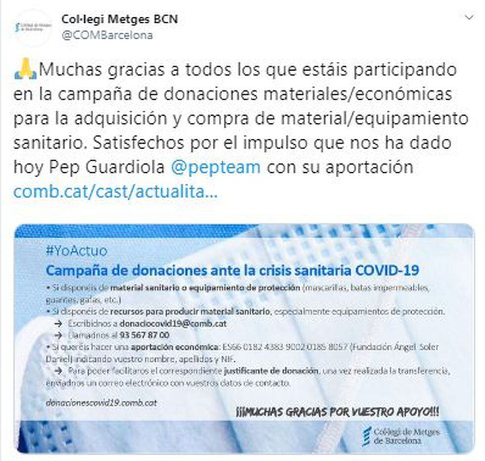 El millón de euros aportado por Guardiola se suma a los 33.000 euros que lleva recaudado el Colegio de Médicos, en una campaña que se inició el pasado 21 de marzo. El material será distribuido a los centros sanitarios de toda Cataluña, de acuerdo con las necesidades y urgencias, y en coordinación con el Departamento de Salud de la Generalitat.