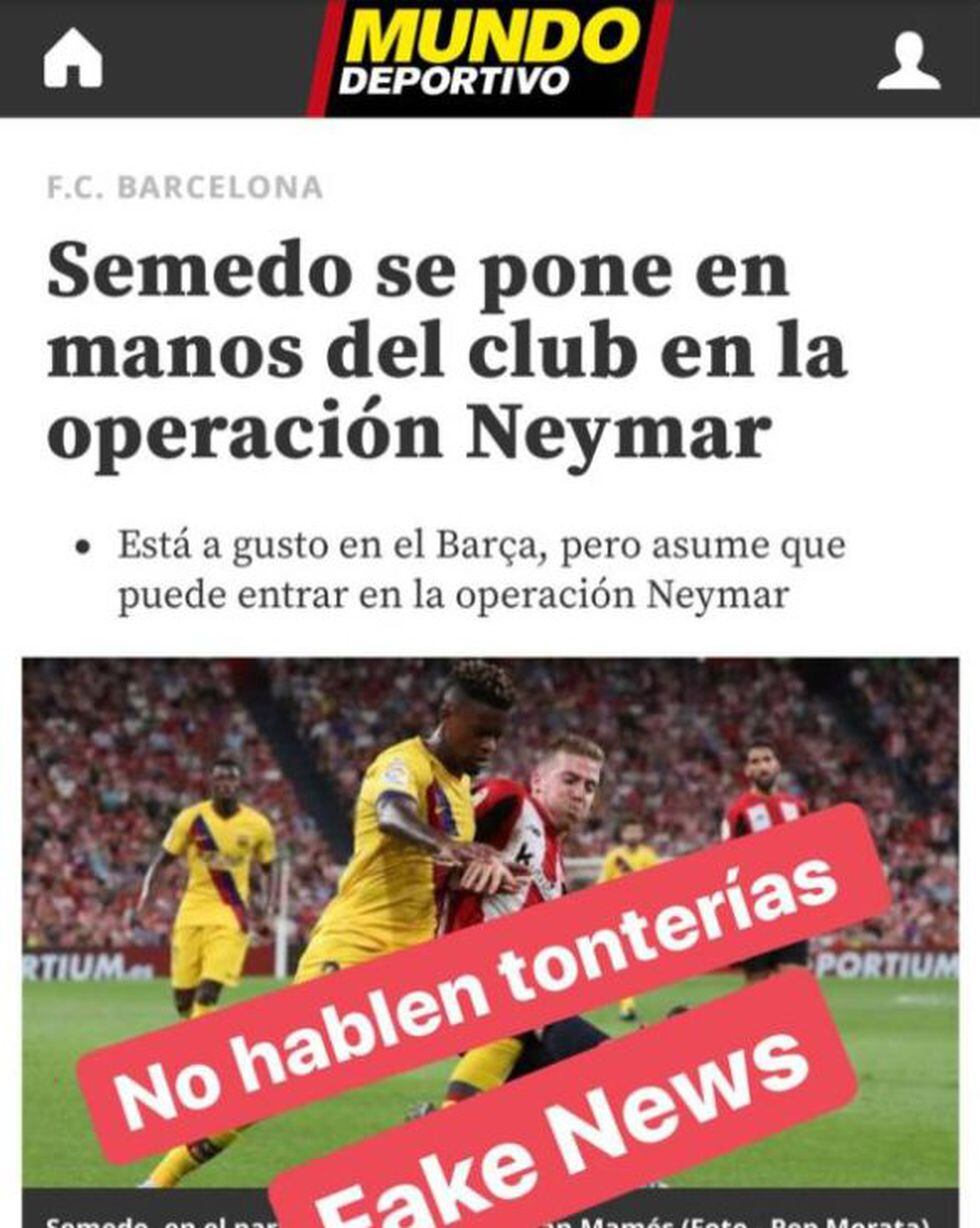 "No hablen tonterías. FAKE NEWS", fue lo que puso Semedo en la mencionada red social, acompañado de una imagen de un medio español que indica que "se pone en manos del club en la operación Neymar". En cuestión de minutos, su publicación se volvió viral .
