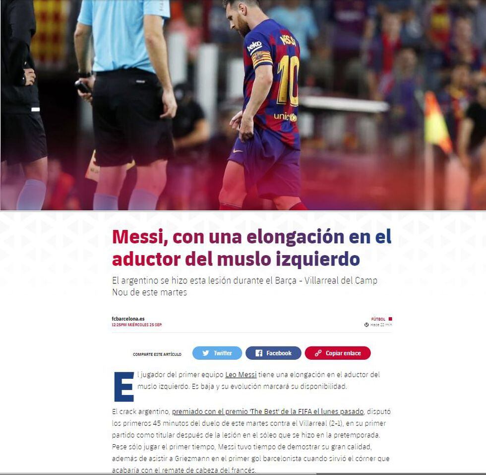 Lionel Messi asustó a todos en el Barcelona vs. Villarreal al salir lesionado a los 45 minutos de juego, en lo que fue su primer partido como titular tras regresar de una lesión en el sóleo en su primer entrenamiento de pretemporada. Todos quedaron expectantes al comunicado oficial del equipo azulgrana. Este miércoles se reveló.