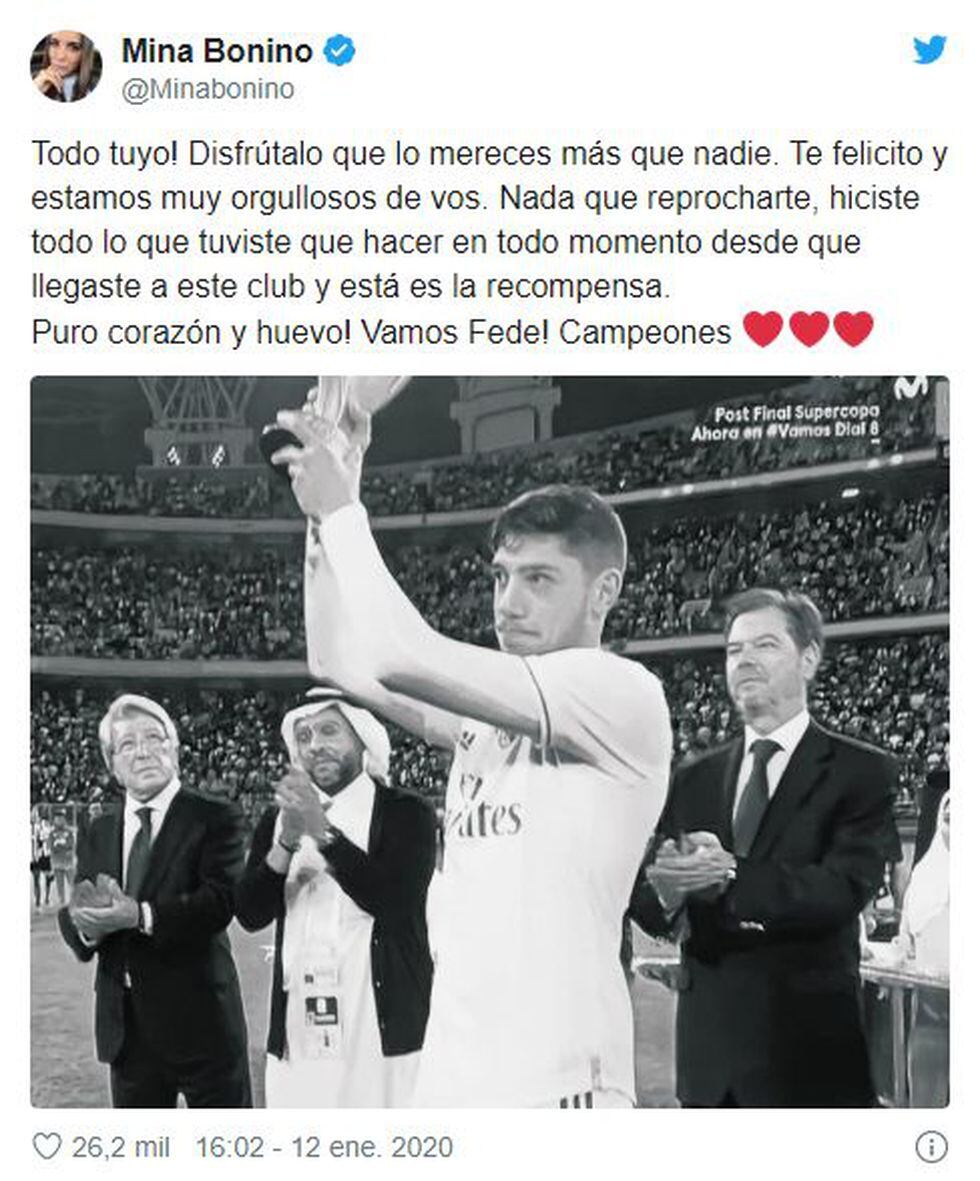 “¡Todo tuyo! Disfrútalo que lo mereces más que nadie. Te felicito y estamos muy orgullosos de vos. Nada que reprocharte, hiciste todo lo que tuviste que hacer en todo momento desde que llegaste a este club y está es la recompensa. ¡Puro corazón y huevo! ¡Vamos Fede! Campeones”, fue lo que escribió Bonino sobre Valverde en su cuenta en Twitter.
