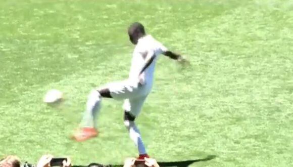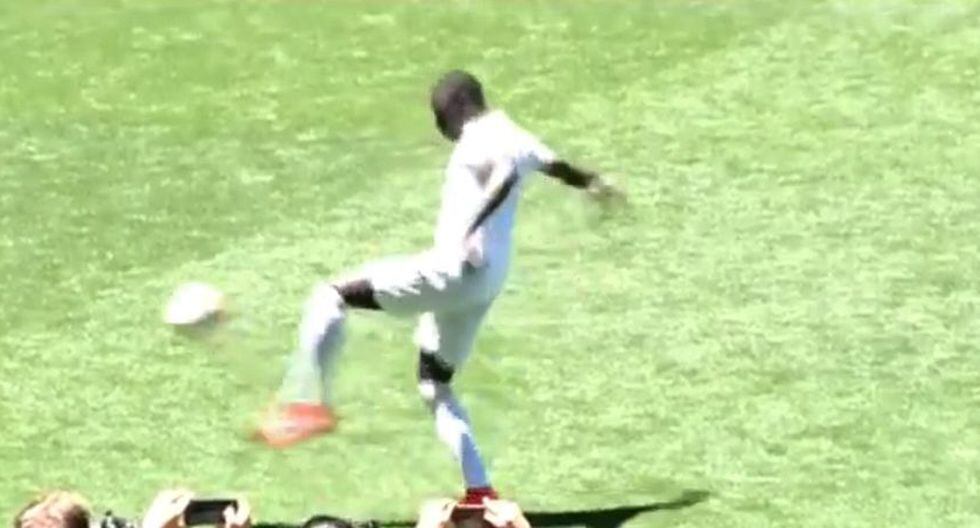 El jugador procedente del Olympique de Lyon tomó el balón y realizó ligero toques, pero al parecer se puso nervioso y este se le fue, sonriendo y desatando una que otra risa entre los presentes. Luego se reivindicó haciendo unas cuantas más.