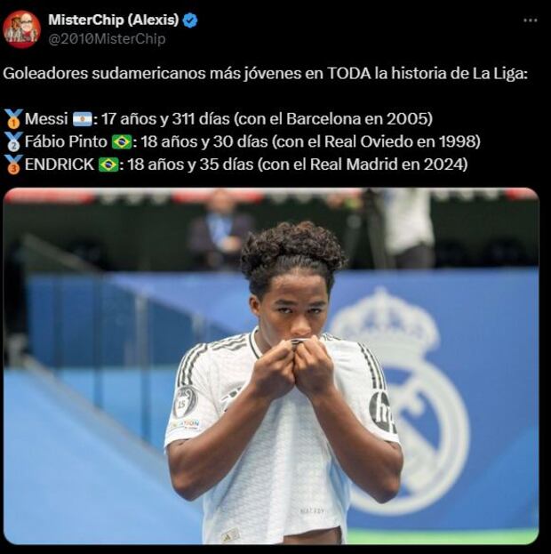 El tanto de Endrick no soló significó el 3-0 de Real Madrid, sino también la llegada de un récord. “Endrick (18 años y 35 días) se convierte en el jugador extranjero más joven en marcar para el Real Madrid en toda la historia de LaLiga. Le quita el récord a Varane, que le marcó al Rayo en 2011 con 18 años y 152 días”, publicó el estadístico MisterChip.