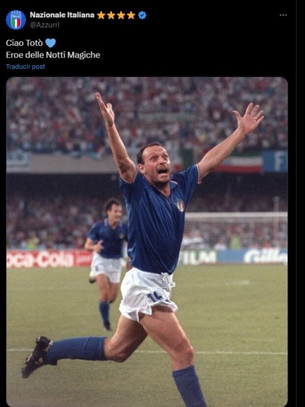 La selección italiana fue una de las primeras en hacerlo a través de sus redes sociales: “Adiós, ‘Totò’. Héroe de las Noches Mágicas”, publicó, destacando las hazañas de Schillaci durante el Mundial de 1990, donde su actuación fue determinante para llegar hasta las semifinales. En su honor, se guardará un minuto de silencio en todos los partidos de fútbol que se jueguen en Italia desde este miércoles hasta el próximo domingo, como anunció la Federación Italiana de Fútbol (FIGC).