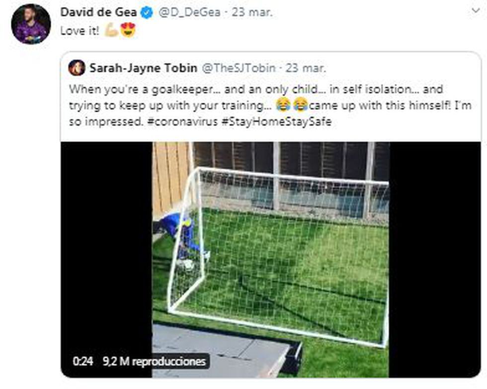 “Cuando eres un portero... y un hijo único... en auto aislamiento... y tratando de seguir tu entrenamiento... se le ocurrió esto mismo! Estoy tan impresionada”, publicó la mamá. El video rápidamente se hizo viral en redes sociales y hasta recibió mensajes de David de Gea y Peter Schmeichel.