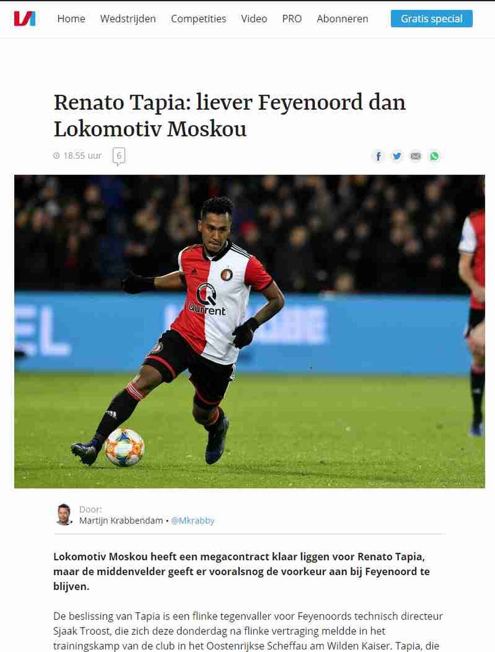 Según informó este jueves el portal holandes Voetbal International, con su nota titulada , "Renato Tapia: prefiere Feyenoord que Lokomotiv Moscú", el peruano no tiene intenciones de jugar en Ruisa y quiere pelear el puesto en el equipo de Jaap Stam. El informe añade que el "Lokomotiv Moscú tiene un mega contrato listo, pero el centrocampista no lo tomará en cuenta".