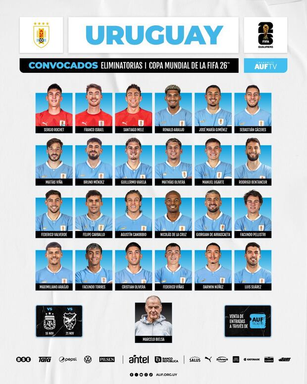 Los partidos de clasificación hacia la Copa del Mundo 2026 continúan con la celebración venidera de otra jornada doble de las Eliminatorias Sudamericanas. La selección de Uruguay, un equipo históricamente presente en la máxima fiesta del fútbol, se enfrentará, este jueves, a Argentina en La Bombonera, seguido por un choque contra Brasil, el martes de la semana próxima, en el estadio Centenario, como parte de las fechas 5 y 6. Con relación a esto, el lunes 13 de noviembre, el entrenador Marcelo Bielsa ha anunciado la lista de los 24 jugadores convocados, con el retorno de Luis Suárez.