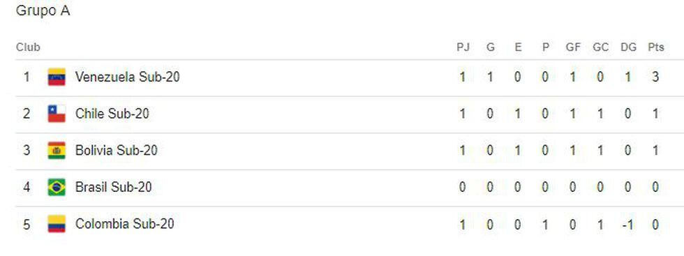 En la primera fecha del Sudamericano Sub 20, Venezuela derrotò (1-0) a Colombia y la selección local, Chile empató con Bolivia (1-1). Así marcha la tabla de posiciones del grupo A