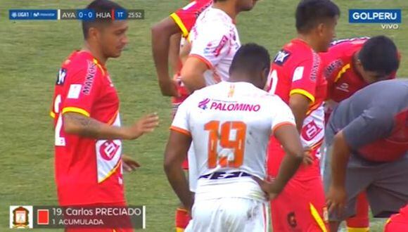 A los 26 minutos de iniciado el compromiso, Sport Huancayo estuvo cerca de generar el contraataque que abra el marcador, pero Preciado apareció para detener la jugada, aunque no de forma acertada. Con un tremendo golpe, por poco deja inhabilitado a Salcedo el resto de la temporada.