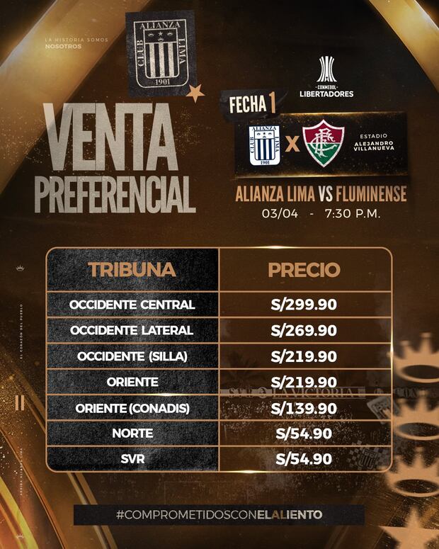 Cabe destacar que los boletos para el partido entre Alianza Lima y Fluminense, por Copa Libertadores, tendrán un costo de 54.90 soles (populares norte y sur), 139.90 (oriente conadis), 219.90 (oriente y occidente silla), 269.90 (occidente lateral) y 299.90 (occidente central).
