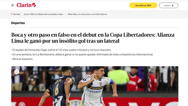 Finalmente, en la sección deportiva del diario Clarín, remarcaron el hecho de que el gol de Alianza Lima haya llegado de un saque de banda: “Boca y otro paso en falso en el debut en la Copa Libertadores: Alianza Lima le ganó por un insólito gol tras un lateral”, escribieron. ¿Hay optimismo en Argentina por la vuelta? No tanto: “Habrá revancha el próximo martes en la Bombonera y la serie está abierta, claro. Sin embargo, la incertidumbre azul y oro tiene que ver con un nivel subterráneo”, aseveraron.
