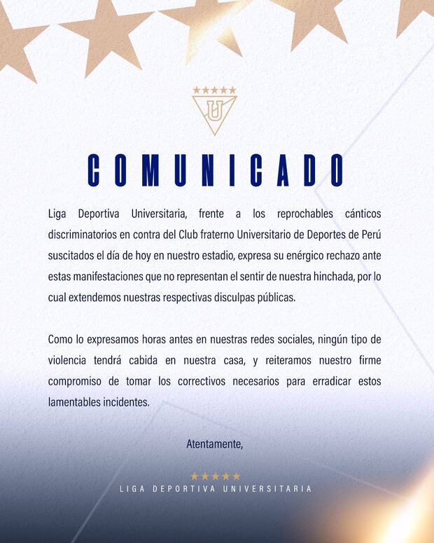 “Liga Deportiva Universitaria, frente a los reprochables cánticos discriminatorios en contra del Club fraterno Universitario de Deportes suscitados el día de hoy en nuestro estadio, expresa su enérgico rechazo ante estas manifestaciones que no representan el sentir de nuestra hinchada, por lo cual extendemos nuestras respectivas disculpas públicas”, señaló Liga de Quito en el escrito.