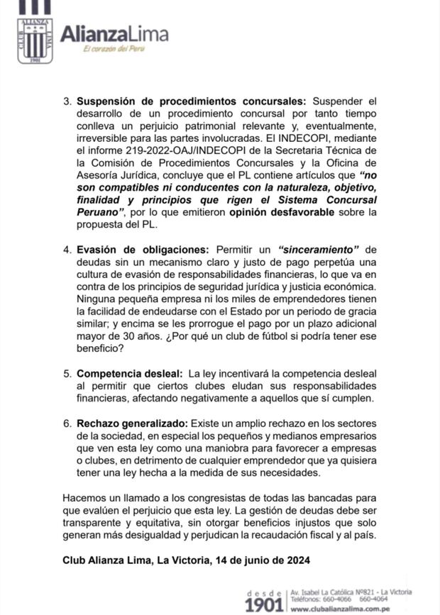 Hacia finales de mayo, la Comisión de Economía dio su aprobación mayoritaria al dictamen del Proyecto de Ley de Fortalecimiento de las Organizaciones Deportivas Dedicadas a la Práctica del Fútbol (Proyecto de Ley 1137/2021-CR), cuyo propósito es regular los procedimientos concursales y facilitar la estabilidad financiera de ciertos clubes de fútbol. En esa línea, este viernes 14 de junio del 2024, a través de una carta oficial, Alianza Lima manifestó su desacuerdo, exhortando al Congreso de la República a rechazar esta legislación.