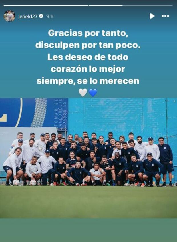 “Gracias por tanto, disculpen por tan poco. Les deseo de todo corazón lo mejor siempre, se lo merecen”, escribió en una de sus historias de Instagram. El delantero, que también cuenta con nacionalidad peruana, colgó una foto en la que aparece acompañado del primer equipo de Alianza Lima, así como del anterior comando técnico liderado por Alejandro Restrepo.