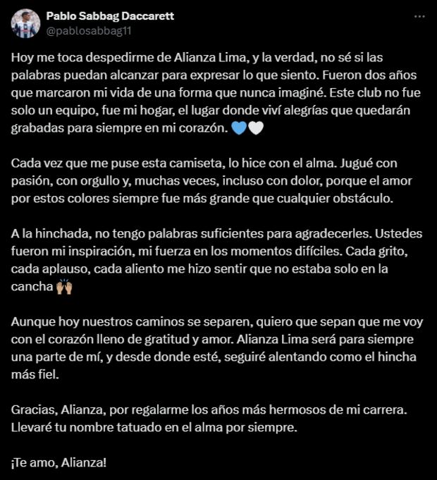 “Aunque hoy nuestros caminos se separen, quiero que sepan que me voy con el corazón lleno de gratitud y amor. Alianza Lima será para siempre una parte de mí, y desde donde esté, seguiré alentando como el hincha más fiel. Gracias, Alianza, por regalarme los años más hermosos de mi carrera. Llevaré tu nombre tatuado en el alma por siempre ¡Te amo, Alianza!”, finalizó Sabbag en la publicación.